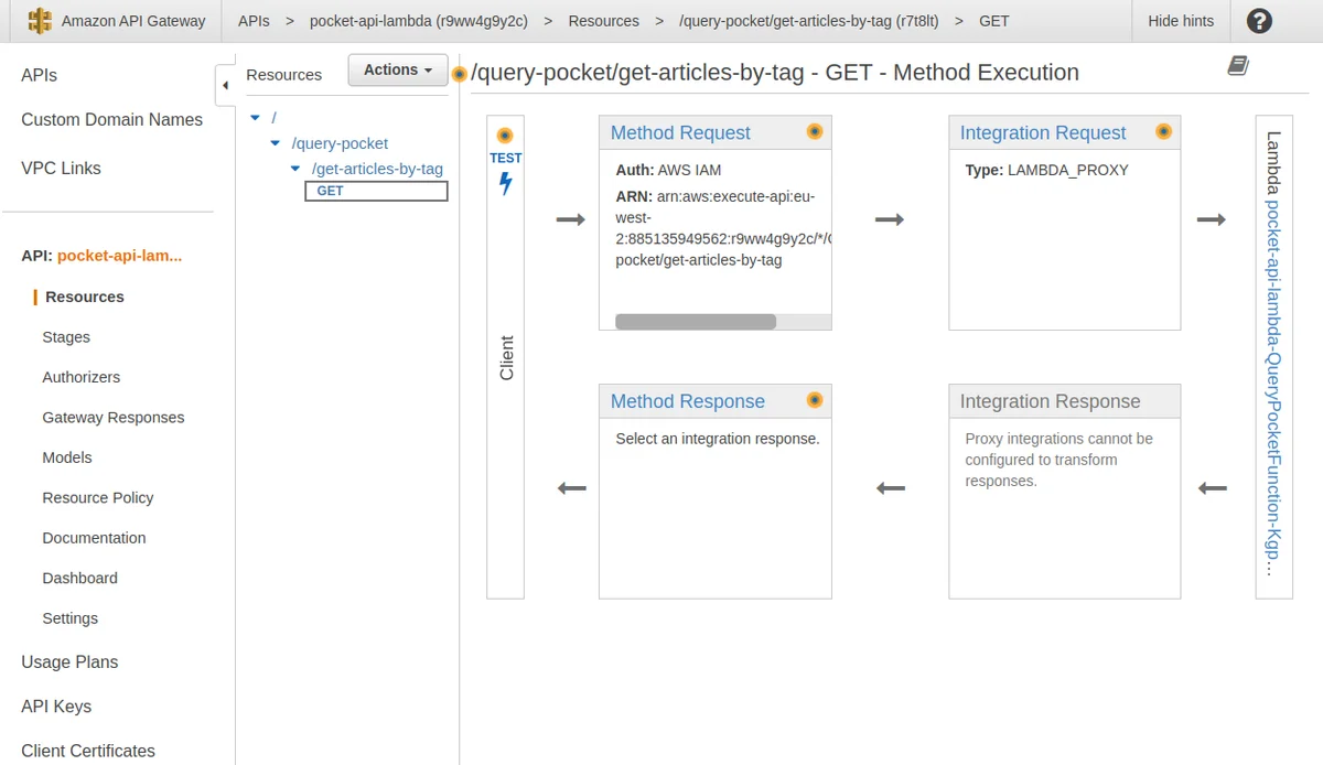 And in API Gateway the API has also been set up: