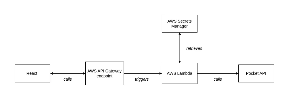 The Lambda is just a wrapper around the API request - I am not storing any data in a database. Using a Lambda means that I can access my Pocket API credentials securely on the backend and also sidestep the issue of Pocket not allowing CORS requests from a frontend.