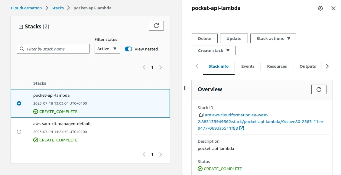 If I go to CloudFormation in the AWS I will see that the pocket-api-lambda