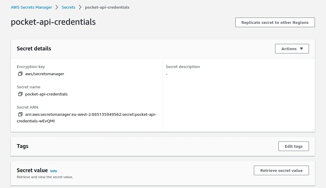 This is great for production but when I am working locally, I don’t want to keep making requests to Secrets Manager as this is unnecessary and could become costly. Instead I will utilise environment variables for the different deployment context and reserve calls to Secrets Manager for when the Lambda is executing in production. When working locally, I will source the Pocket credentials from an env file.