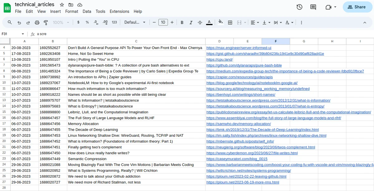 Each tag has a corresponding sheet that lists the articles in reverse chronological order. The lambda executes on a cron timer once a day.