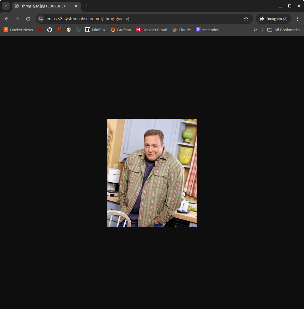 The file I just created can be accessed on the public internet at https://eolas.s3.systemsobscure.net/test.txt.