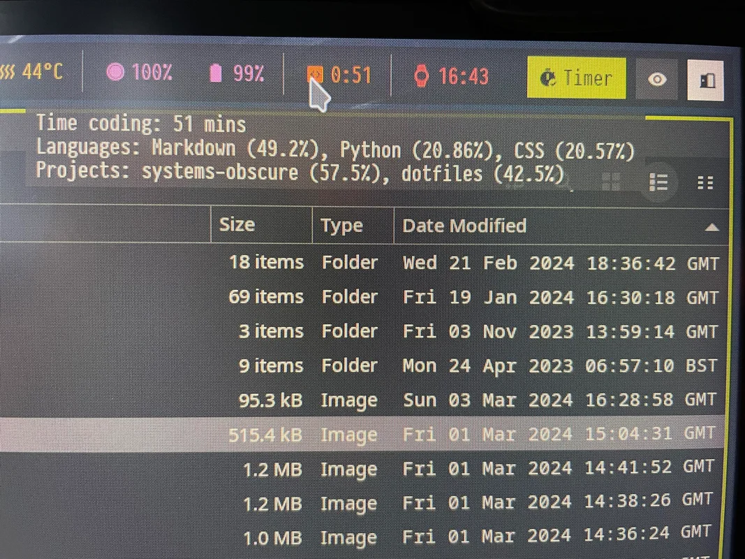 I’ve recently started using time warrior to track my extra-curricular coding and study. This is a command-line time-tracker so it integrates really well with Waybar.
