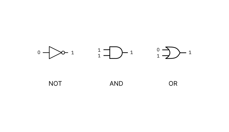 To recap, elementary computational processes can be represented as logical functions. A function consists in one or more Boolean operators processing bits. For each Boolean operator we can construct a chip that represents its truth conditions. We call these chips logic gates. Logic gates are built with transistors that either block or permit the flow of electric current. This makes them behave in a manner almost identical to mechanical switches.